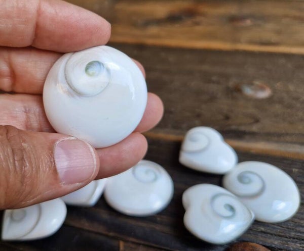 Natuurlijke schelp in hart of rondje geslepen.