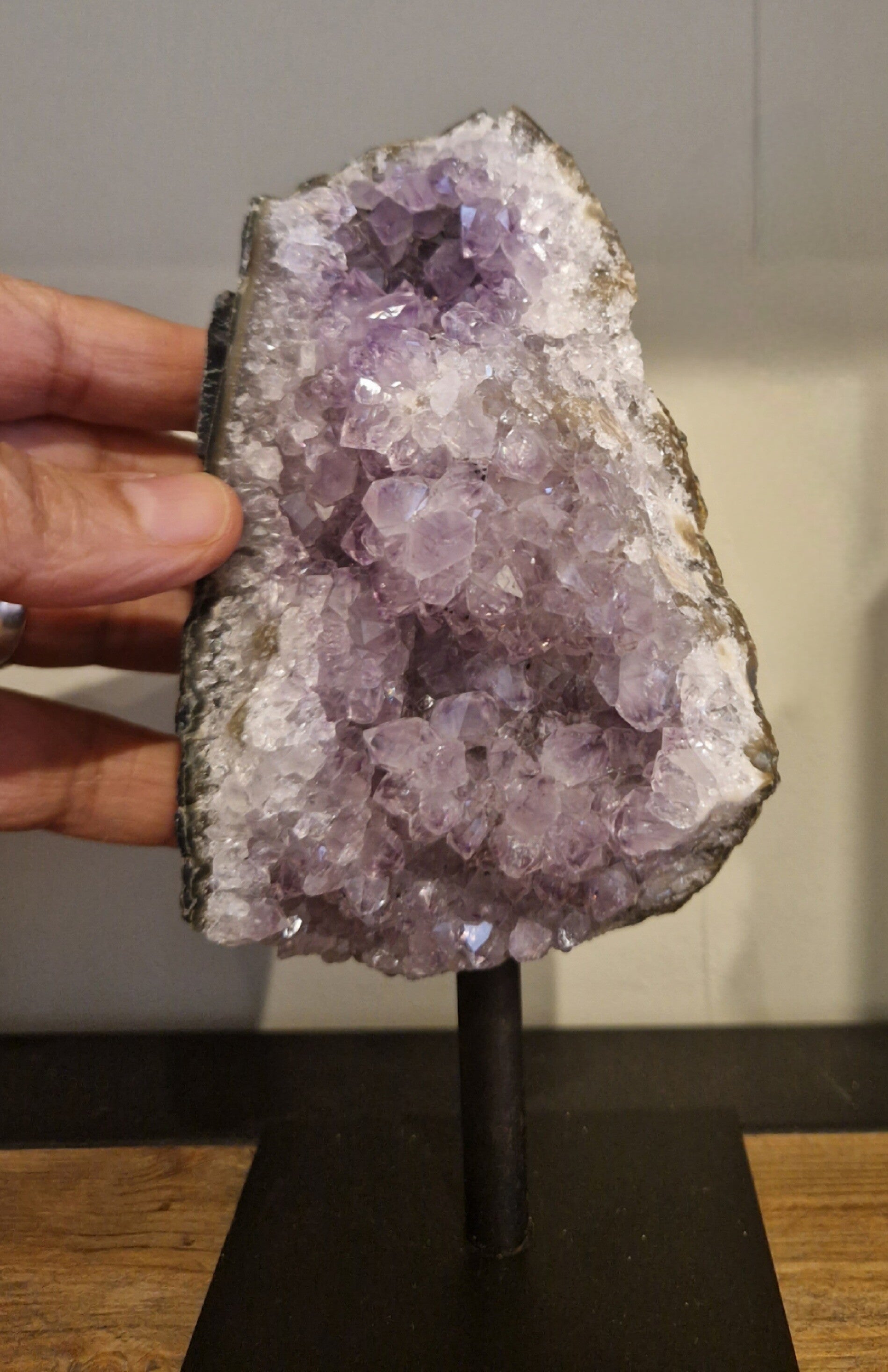 Amethist is een paarse kwarts die van licht- tot donkerpaars voorkomt. De kristallen noemt men gekristalliseerd of druzy. Waarbij de kristallen op een nartuurlijke manier in een geometrisch vorm groeien en voor een prachtige schittering zorgen.