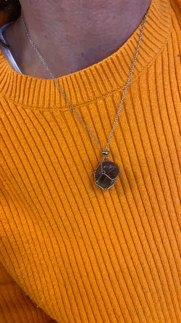 Wat een goed idee een ketting waarbij je in het netje je eigen edelsteen kan plaatsen. Door een slim schijfsysteem sluit je het netje om de steen. Zo kun je vaak afwisselen en genieten van je edelstenen.