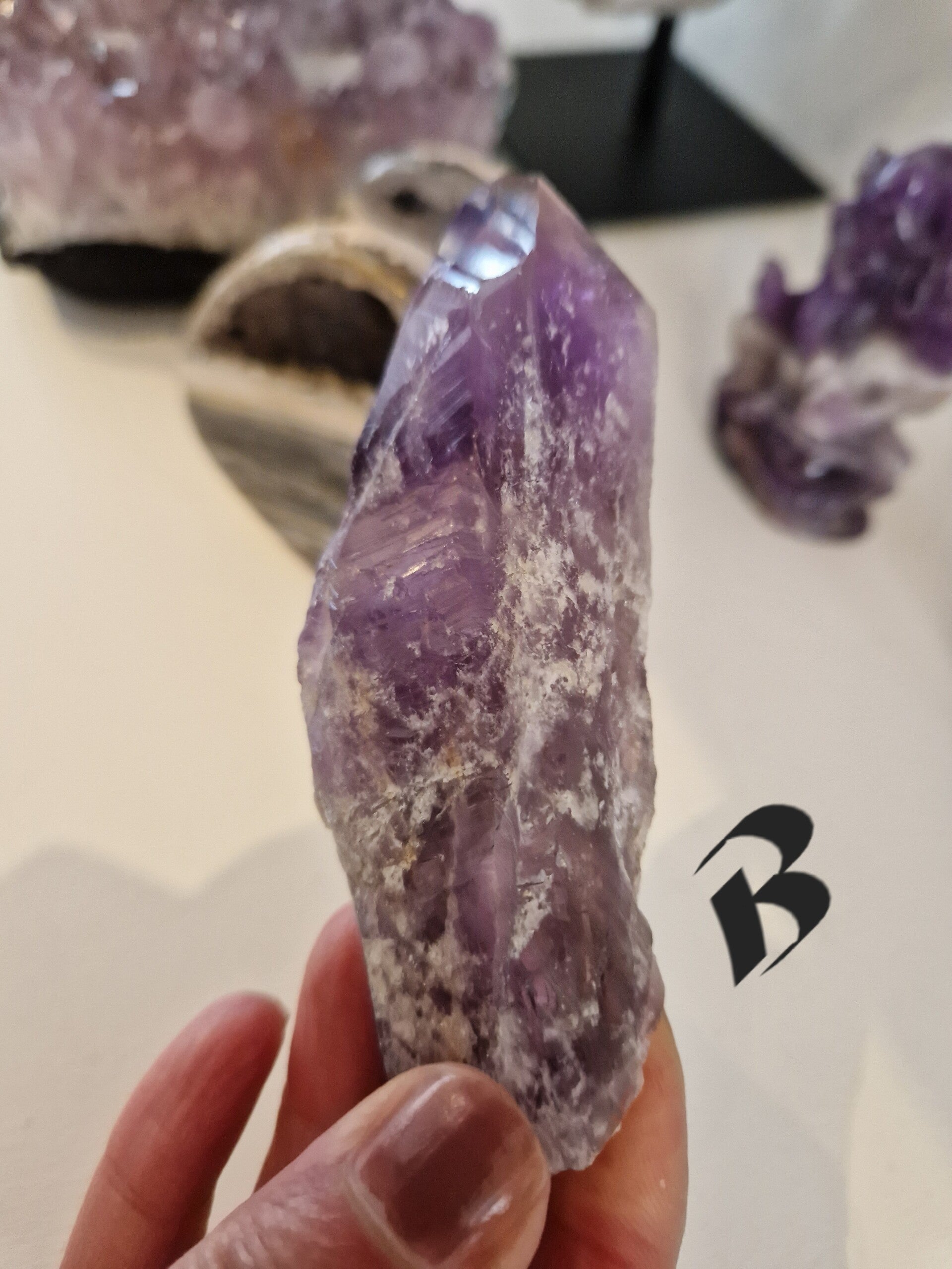 B.Amethist L12cm breedte 4.5 cm, gewicht 132 gram.
