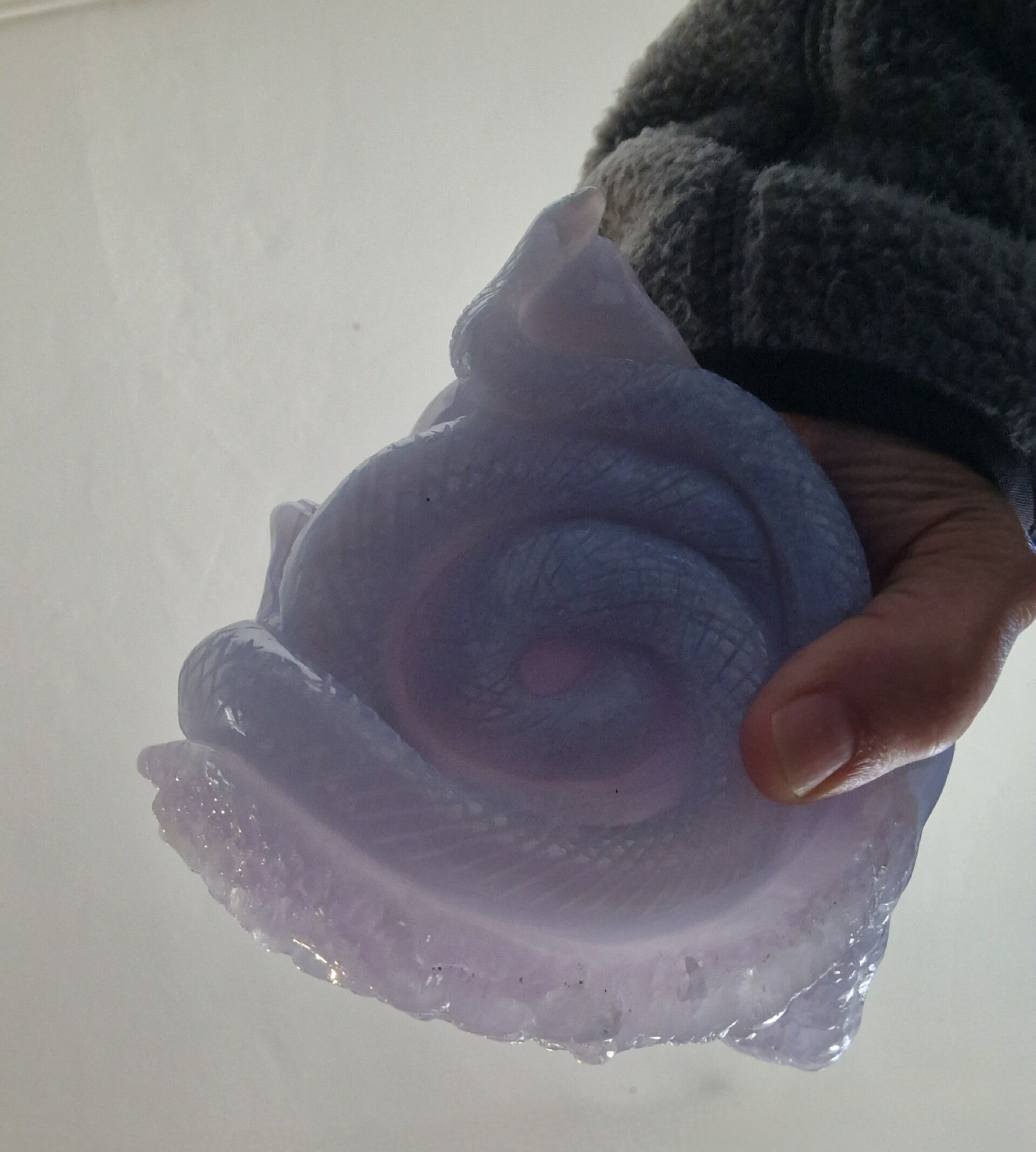 Blue Lace Agaat slang in druzy Amethist. Wat een meesterwerk! De slang ligt perfect gekruld om de steen heen. Aan de achterkant heeft de steen mooie kleine kristalletjes. Een slang om van te houden!