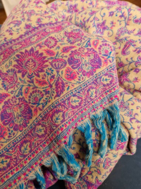 Tibetan Omslagdoek Yak Wool Rose Paars Blauw Creme