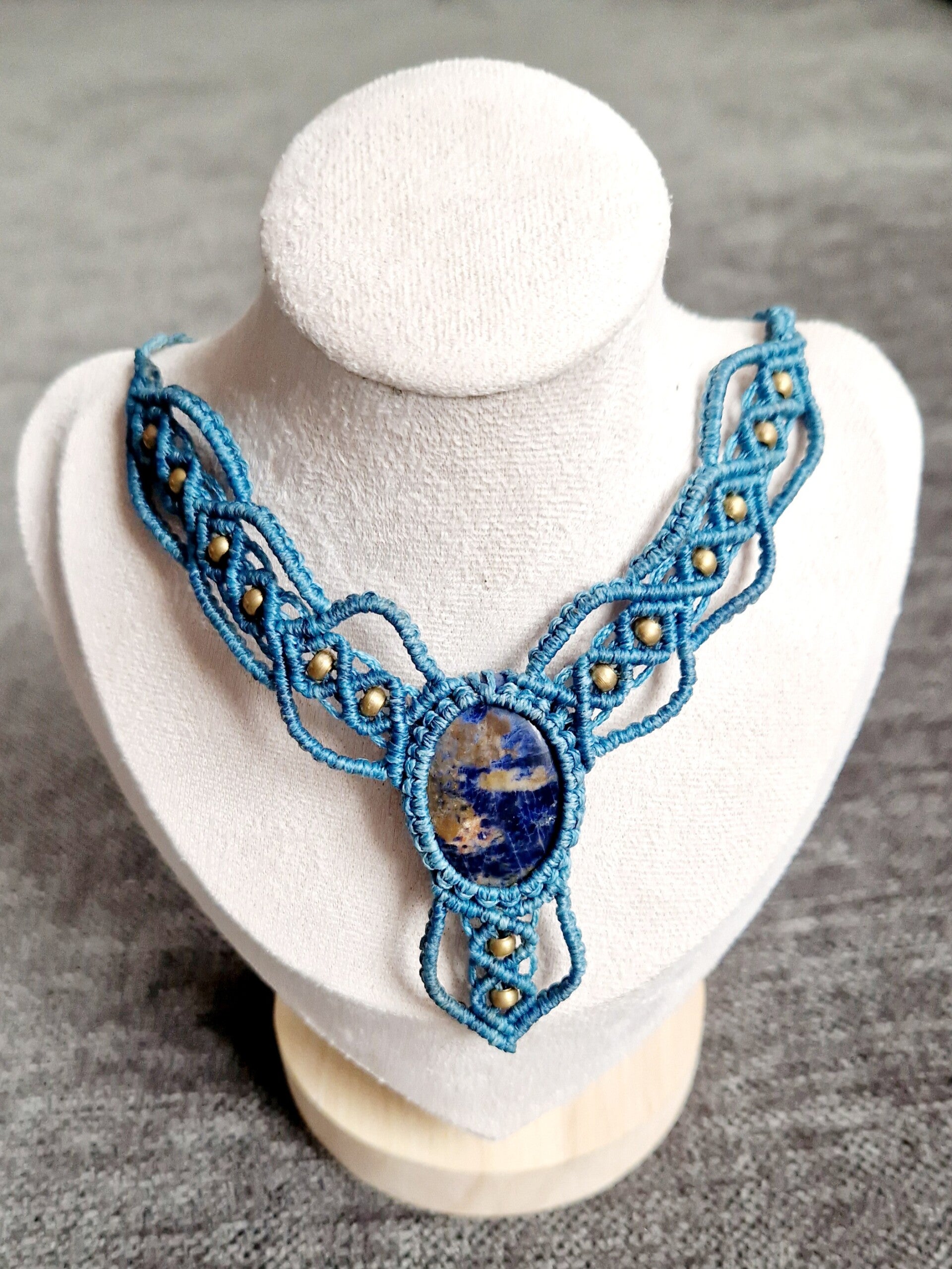 Macramé choker lapis lazuli, In zacht lichtblauw, met goudkleirige kralen. De twee kleuren vullen elkaar goed aan.