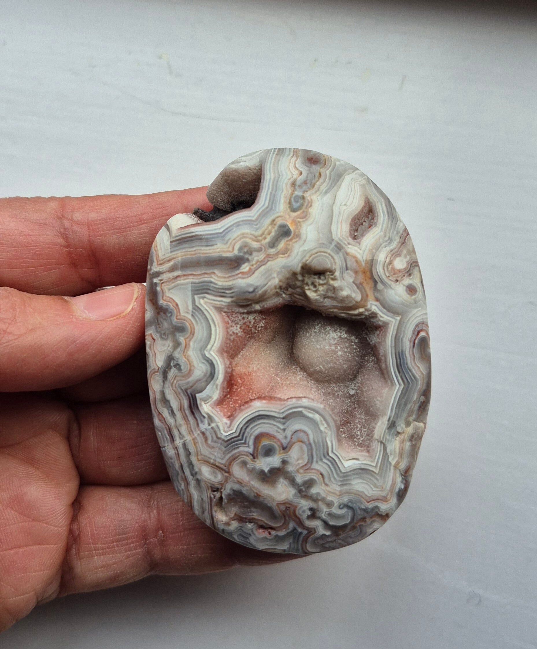 Bij deze steen zie je zie je de druzy in openingen, heel mooi. De banden( strepen) waar agaat bekend om staat zijn schitterend in rechte en krome belijning aanwezig.
