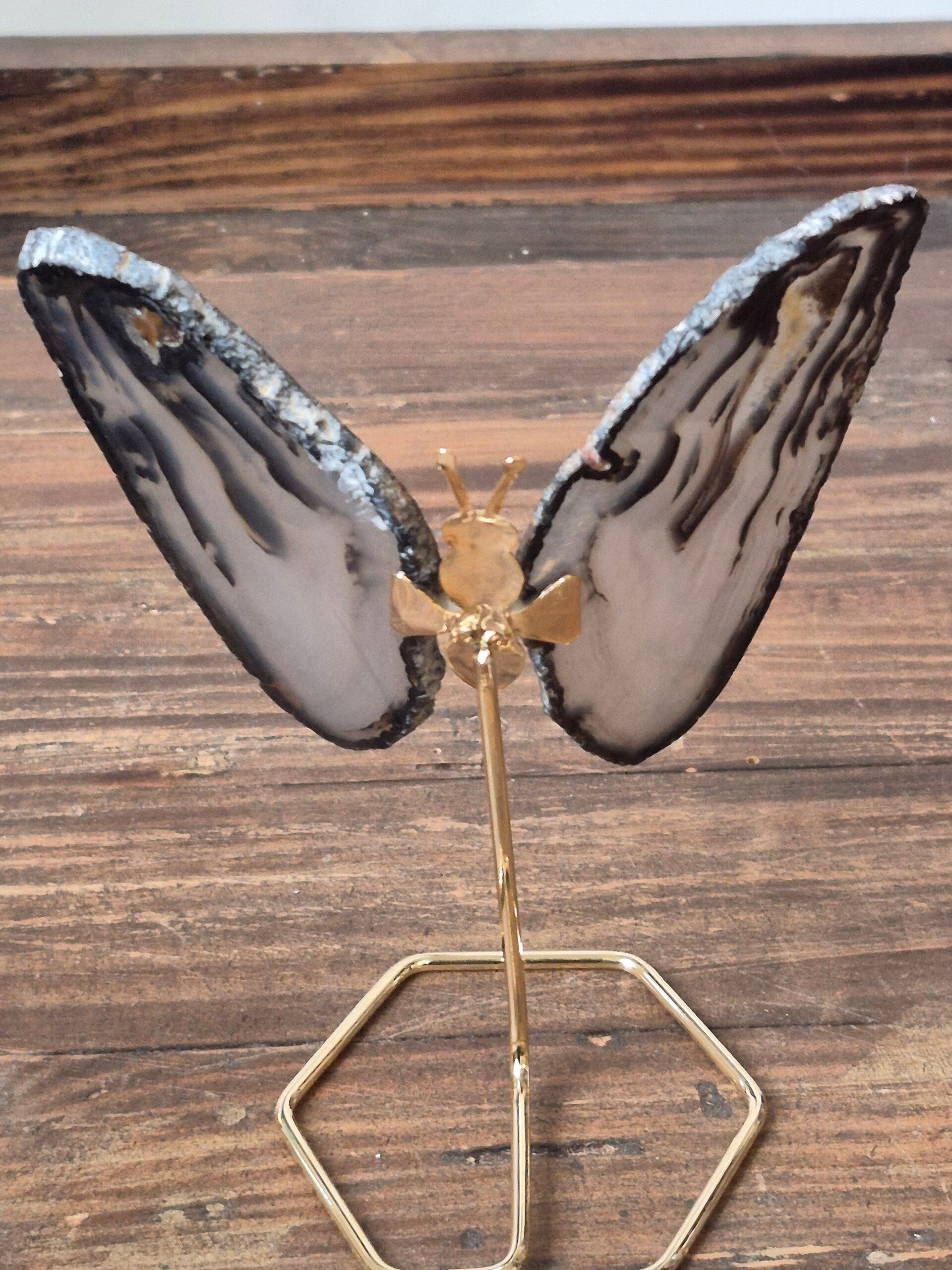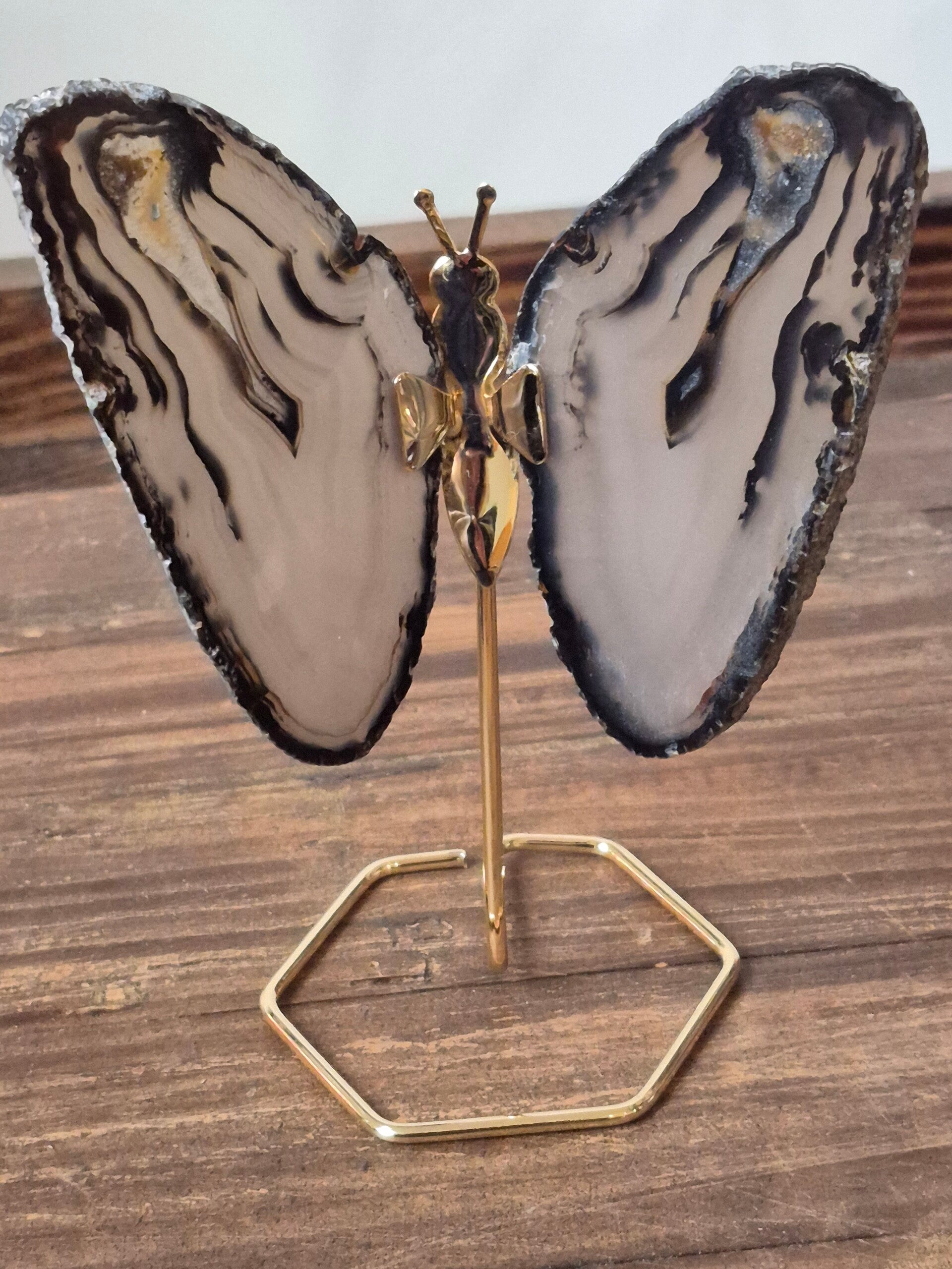 Heel fijntjes deze mooie agaat vlinder op een goudkleurig statief. Geniaal bedacht en zo mooi gemaakt.
