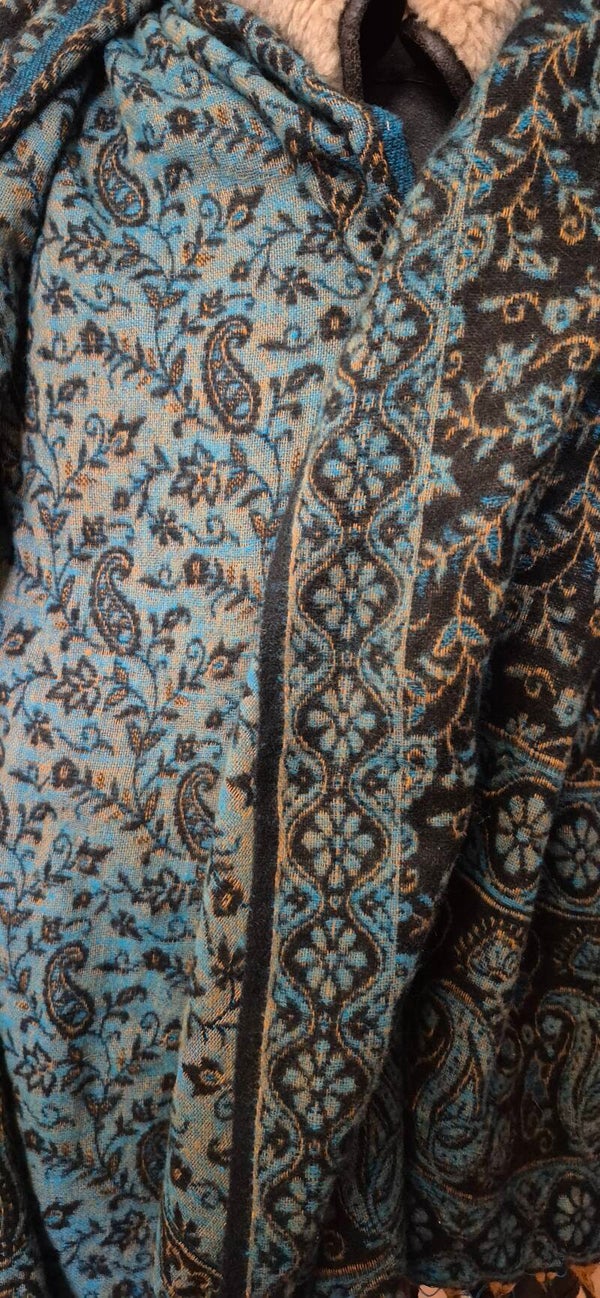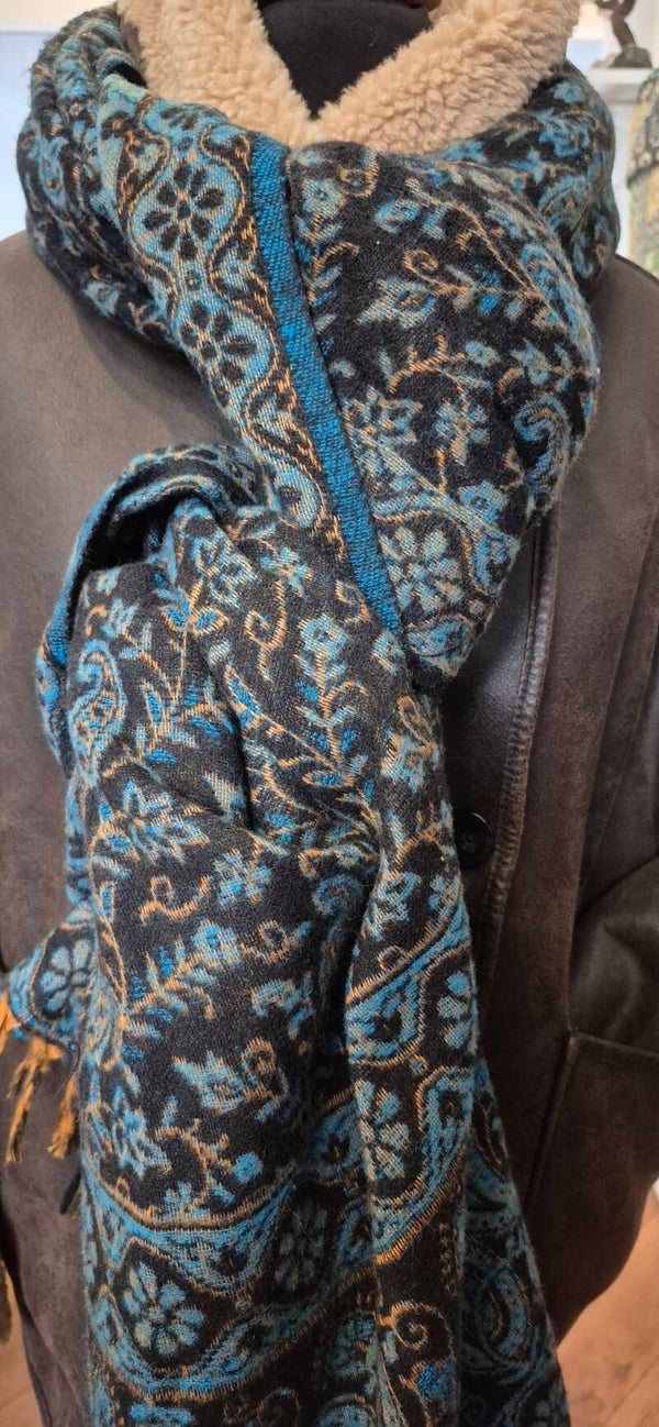 Tibetan Yakwool Sjaal Omslagdoek Blauw Zwart Turkoois