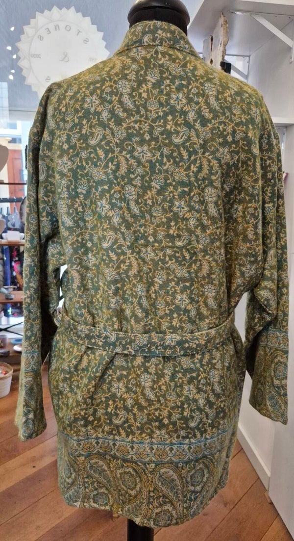 De Kimono is van een blend van wol, gemaakt van de stof van de befaamde Tibetan Sjaal's/ Omslagdoeken. Die bekend staan om hun mooie kleurstelling en ook op de webshop staan.
