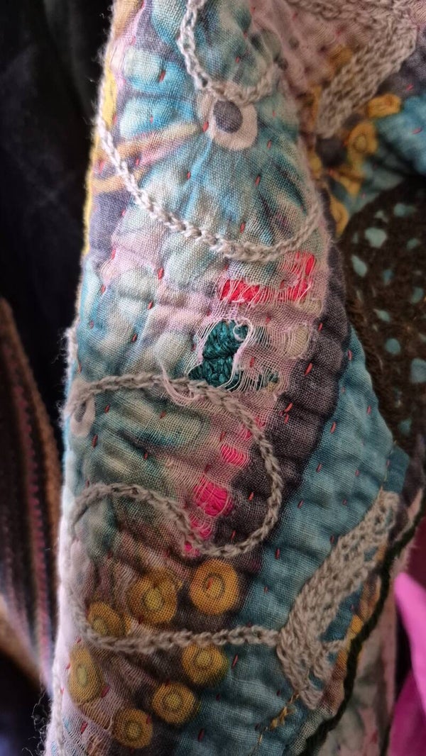 Kantha dankt zijn naam aan een borduur en quilttechniek, die met een eenvoudige stiksels handmatig over de gehele jas als een signatuur aanwezig is.