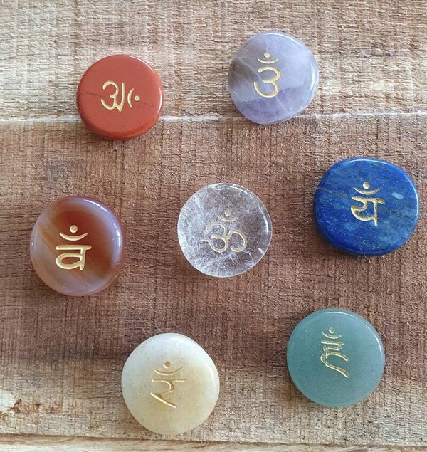 7 Chakra Edelstenen met Sanskriet Symbolen