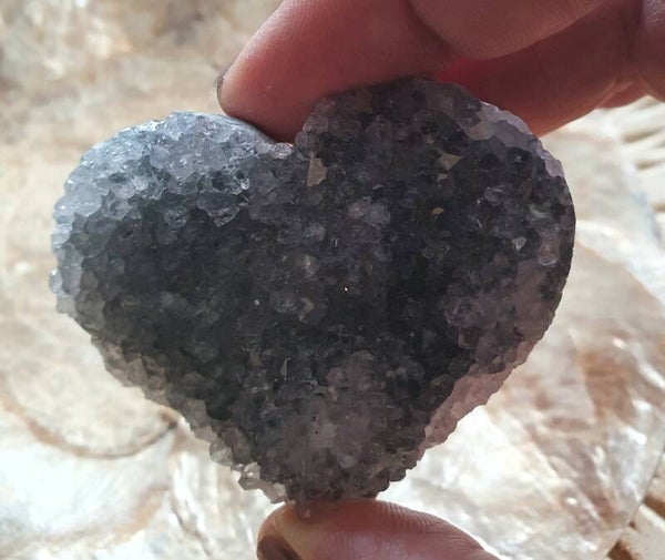 De Amethist Hart is lichtpaars tot wit van kleur en gekristalliseerd. Men noemt het gekristalliseerde ook wel Druzy, waarbij de kristallen op een nartuurlijke manier in een geometrisch vorm groeien en voor een prachtige schittering zorgen.