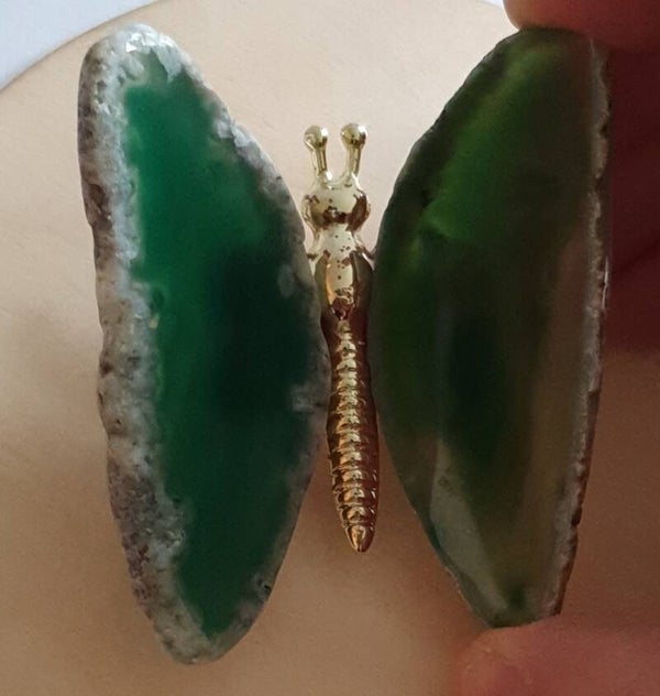 Het lijfje van goudkleurig metaal en aan weerszijden de mooie agaat vleugels.