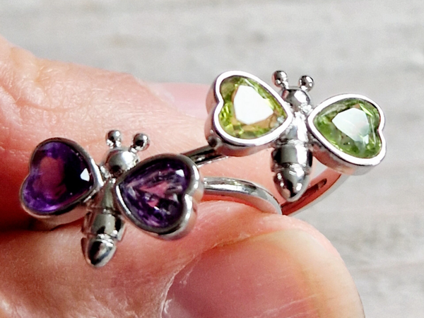 Wat een schattig bescheiden vlinder ringetje van Amethist en Peridoot (Olivijn)