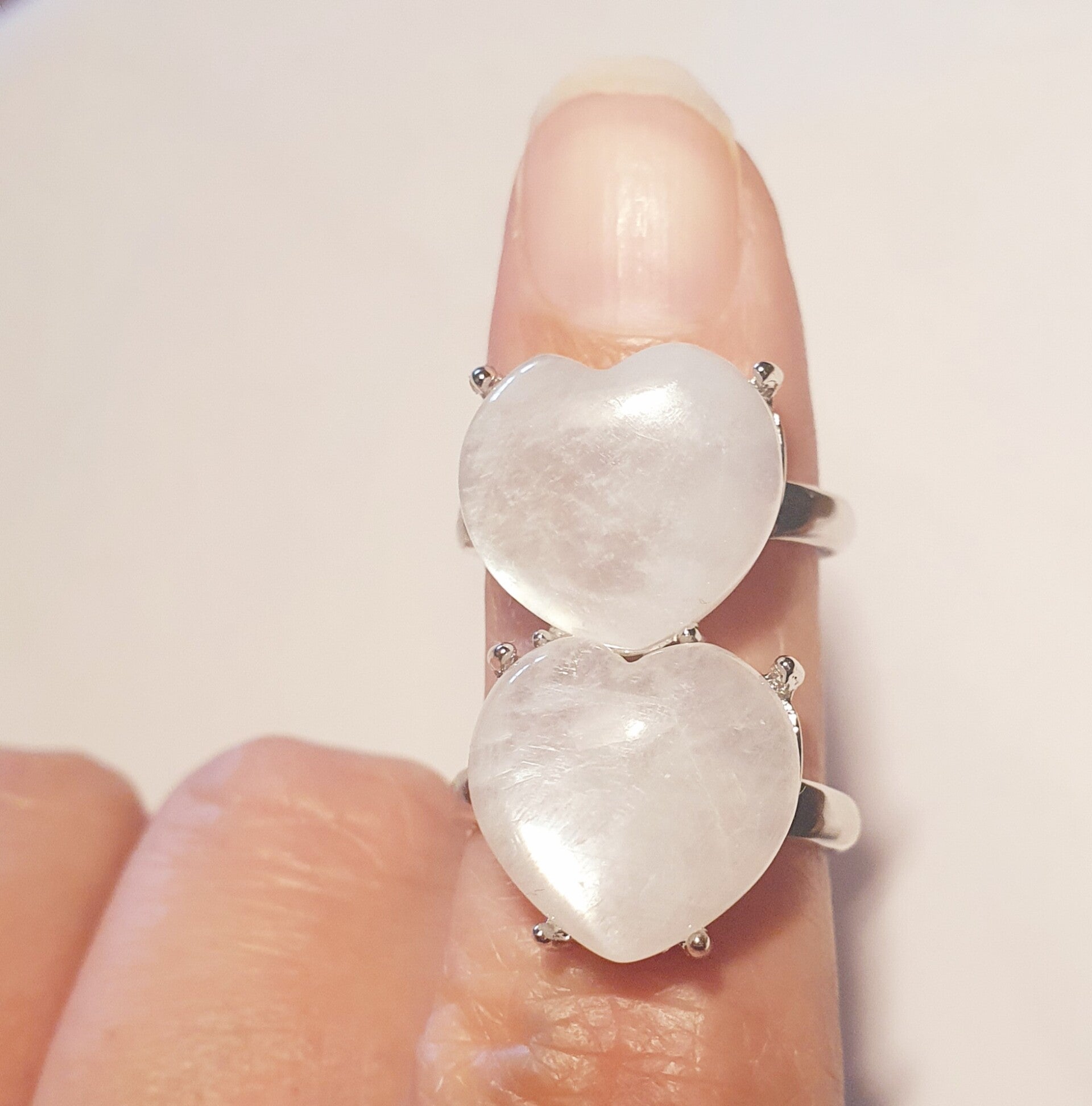 Maansteen ring met een regenboog glinstering in de vorm van een hart. De ring is voor alle maten en verstelbaar door een schuiftechniek.